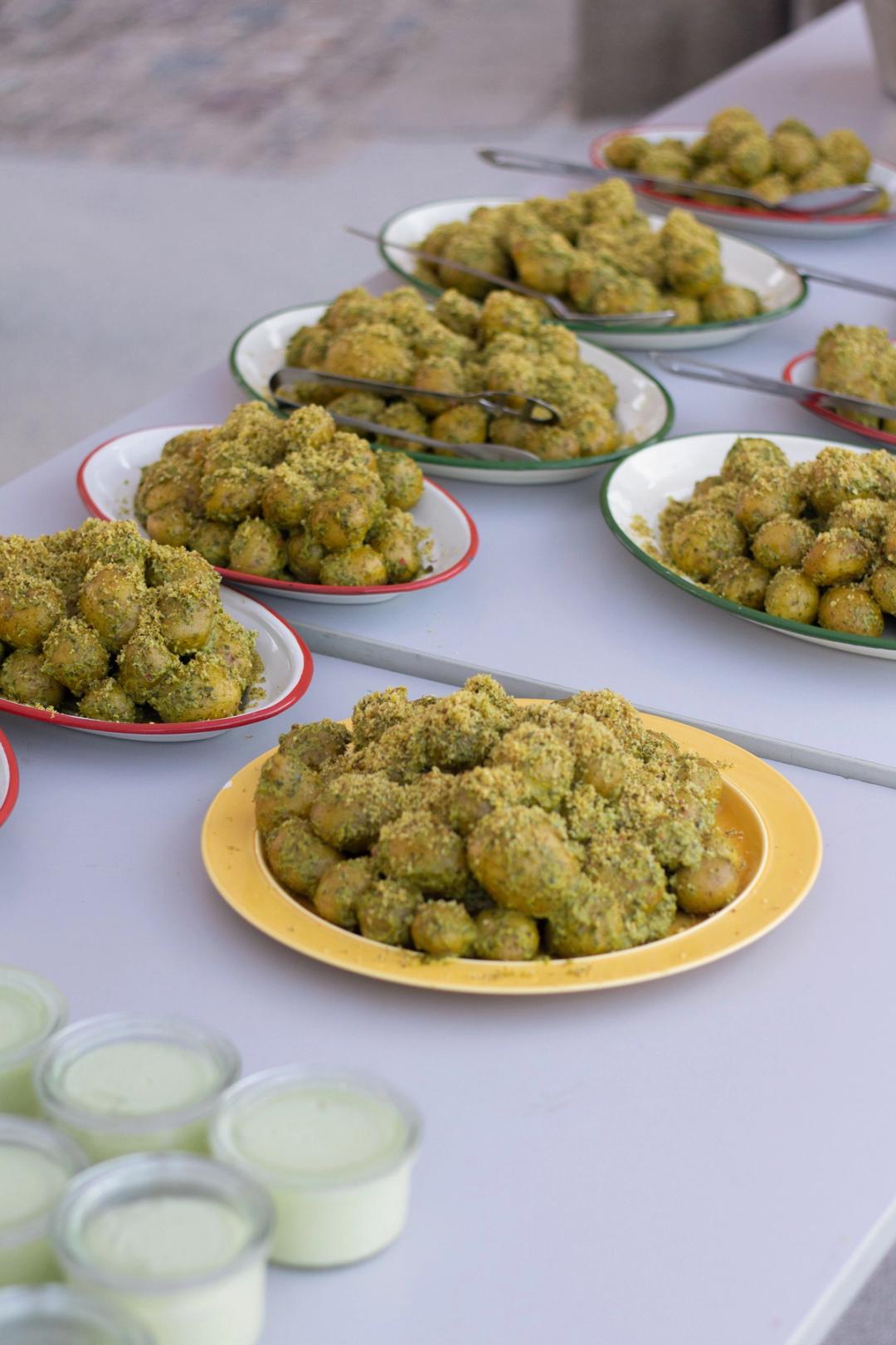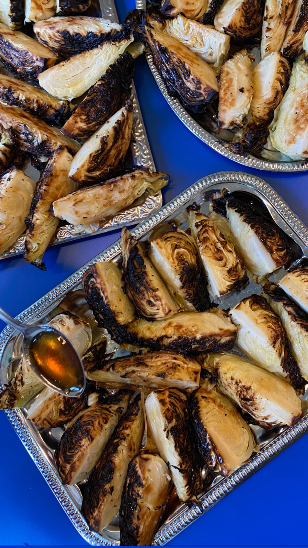 Grillet spidskål med grøn tahindressing med krydrede mandelflager