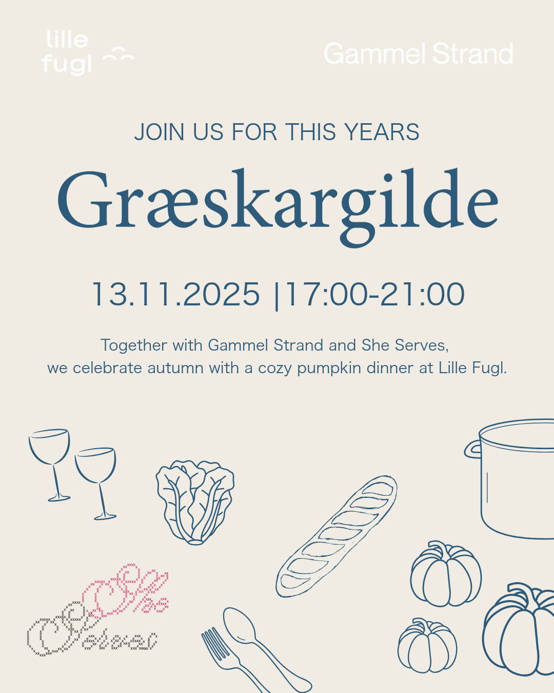 @ Lille Fugl # Social # Mad # Event Græskargilde Lille Fugl x She Serves x Gammel Strand 13. nov. 2025 17.00
