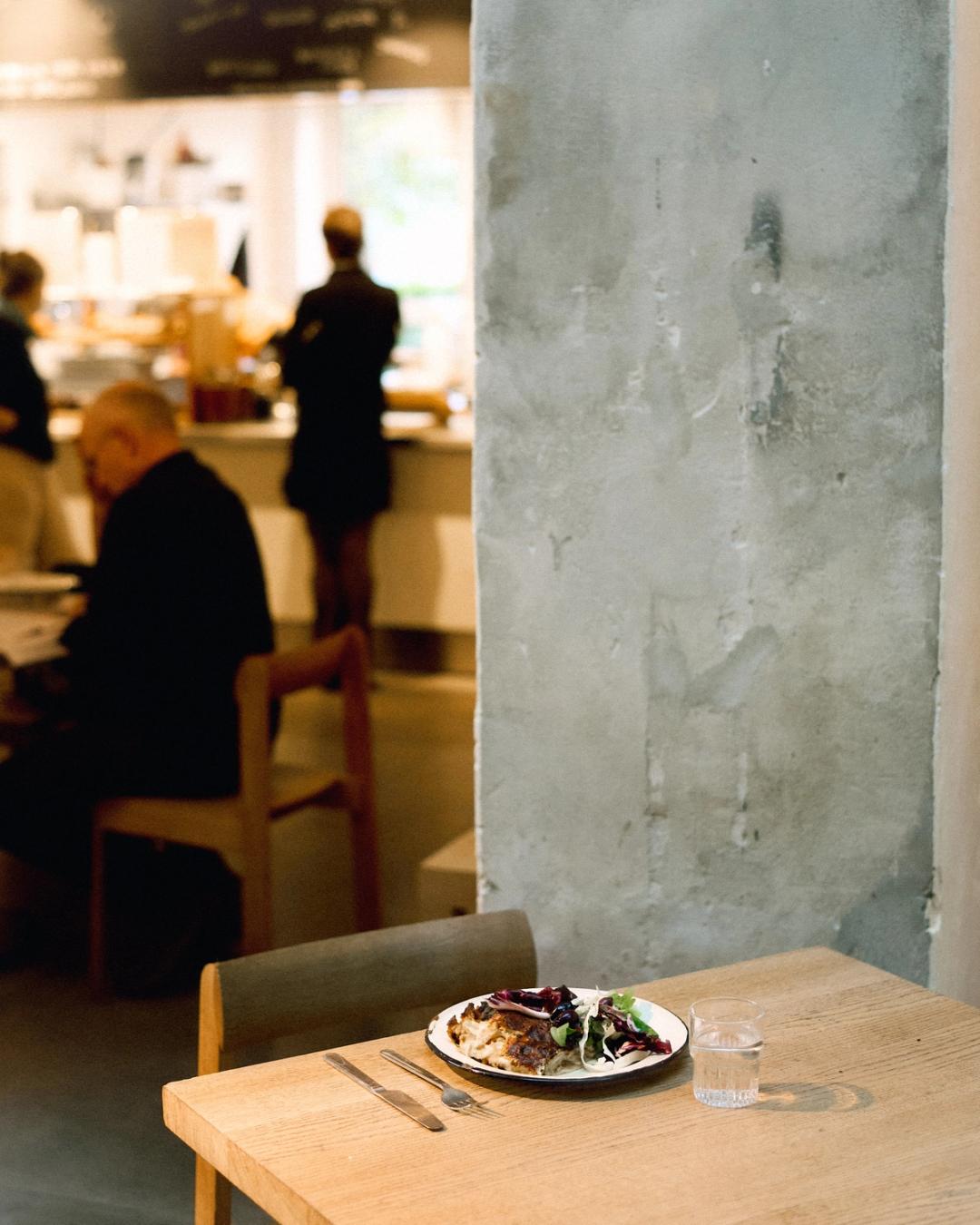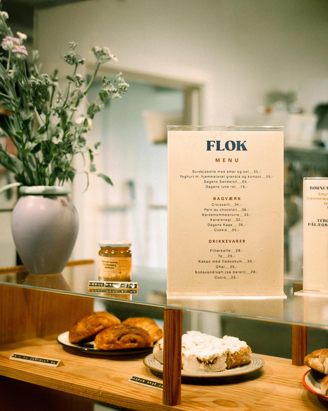 Vi serverer bagværk fra vores bageri Flere Fugle, let morgenmad, dagens ret og har mange børnevenlige muligheder. Der serveres friskbrygget filterkaffe, te og juice, og hver tirsdag og torsdag har vi Fællesspisning på FLOK fra kl. 17-19.